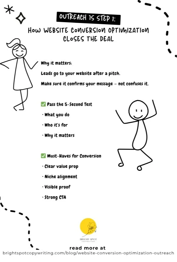 For strong website conversion optimization, every page must support what your outreach promises. That’s how you turn curiosity into connection… and connection into conversion.